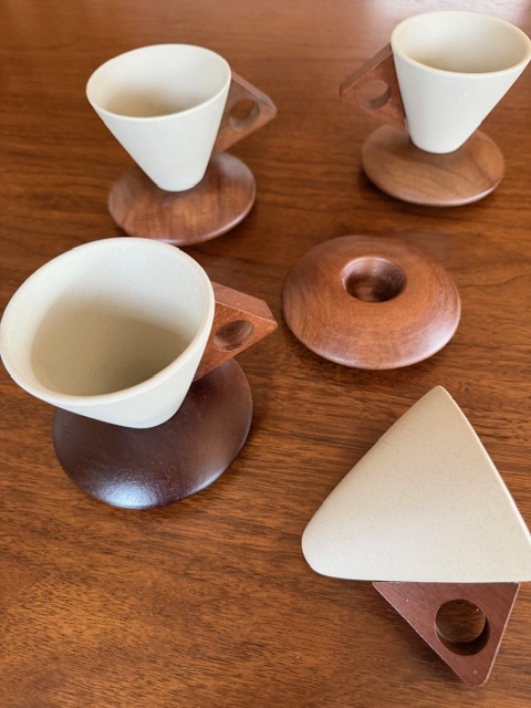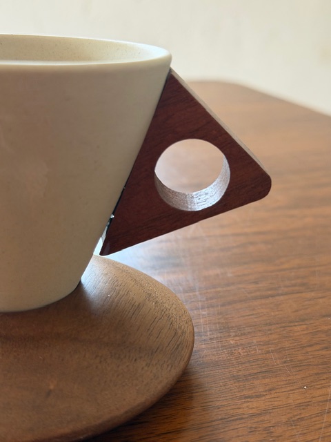 The contrast between the soft matte ceramic and the rich natural wood creates a beautifully balanced composition — part functional mug, part sculptural object. When displayed together, the pieces form a small tabletop installation that celebrates form, texture, and thoughtful design.